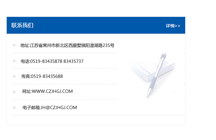 地址:常州市新北區(qū)友邦商務(wù)大廈1幢16、17層  電話:0519-85101652  傳真:0519-85112595  郵編:213022  網(wǎng)址:www.cz-jiayue_cn.zhipeiyi.com  郵箱:xiajifengaa@163.com